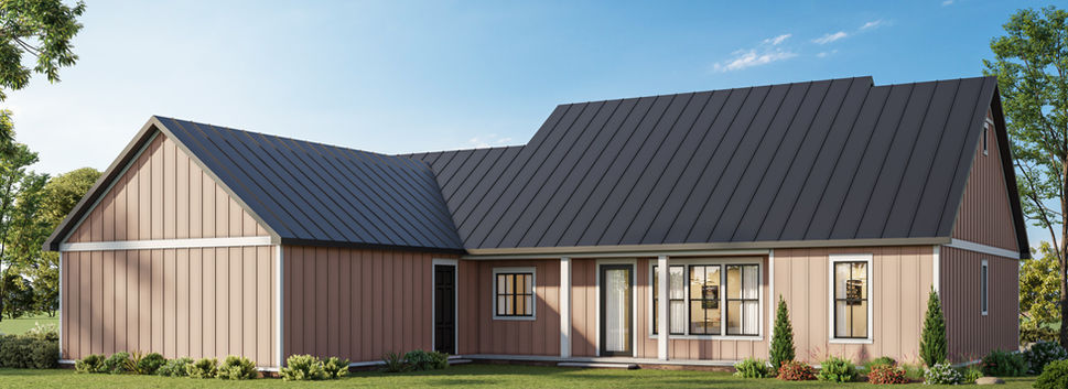 As you “step” inside this modern farmhouse plan, the foyer provides a 10-foot ceiling height and has a small space for decorating to create an inviting front entry. From there the living room reveals an open floor concept with the connecting kitchen and dining area. The living room also features a vaulted ceiling, giving extra height to the space with the warming fireplace and shelving storage adding to the vibe of the room. Entry into the adjoining office is just behind barn doors and the room presents a wonderful amount of space to work, study, or to even re-purpose as a playroom for the children. The kitchen features a center island, a walk-in pantry, and plenty of storage. As an added bonus, the adjoining dining area presents sufficient space for a 6-8 seat table.